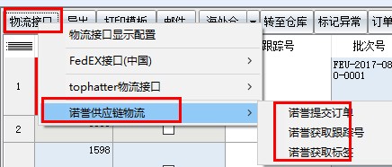 勾选需要提交的订单,然后点击物流接口找到里面的诺誉供应链物流接口,选择诺誉供应链提交订单去提交申请跟踪号,如下图所示