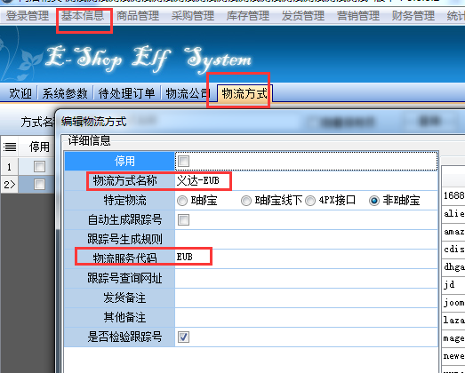 打开基本信息下的物流方式,在物流方式名称中填写具体的物流渠道名称和服务代码,如下图所示:
