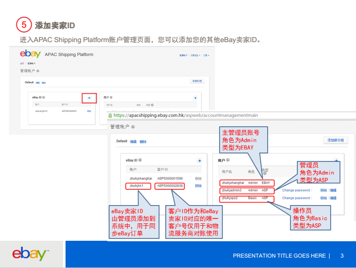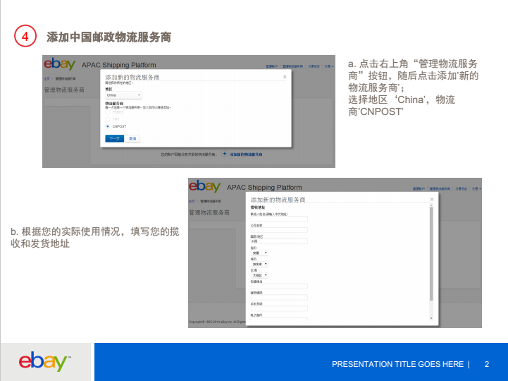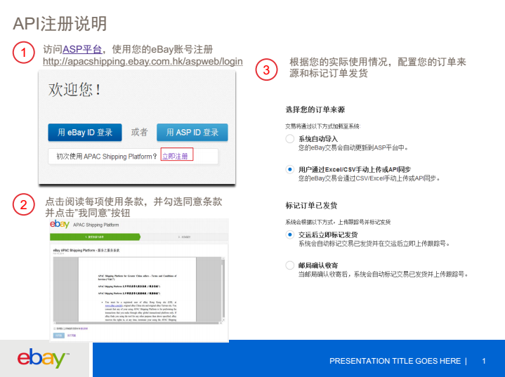 访问ASP平台,使用您的eBay账号注册http://apacshipping.ebay.com.hk/aspweb/login 2.点击阅读每项使用条款,并勾选同意条款并点击”我同意”按钮 3.根据您的实际使用情况,配置您的订单来源和标记订单发货 4.添加中国邮政物流服务商 a.点击右上角“管理物流服务商”按钮,随后点击添加’新的物流服务商’;选择地区‘China’,物流商’CNPOST’ b.根据您的实际使用情况,填写您揽收和发货地址 5.添加卖家ID 进入APAC Shipping Platform账户管理页面,您可以添加您的其他eBay卖家ID。