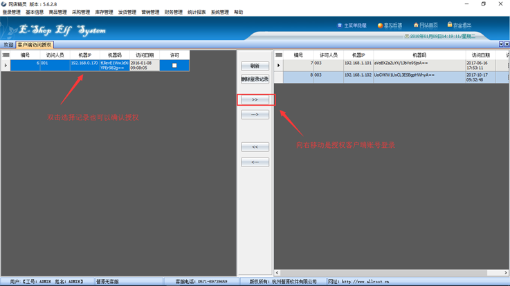 客户端授权是设置客户端机器可以登录网店精灵的许可,设置后,客户端机器才可以访问。窗口如下: 取消某个客户端授权,选择对应登录的电脑ip向左移动。窗口如下: