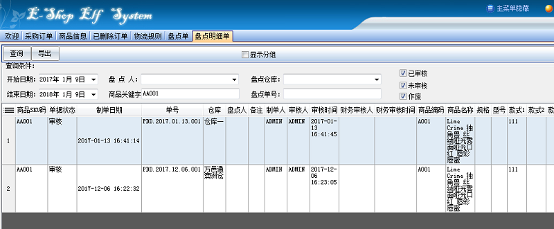 1. 【查询】:指定时间范围,录入商品关键字(编码、名称、SKU、归属人,可模糊查询)盘点人,仓库等筛选条件进行查询