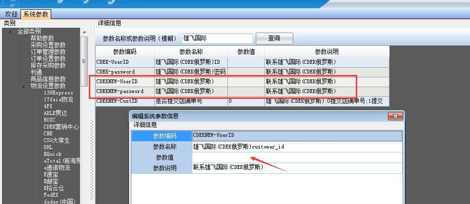 ②:通过搜索条件里输入雄飞国际找到对应设置的地方,选中记录后,点击右边的