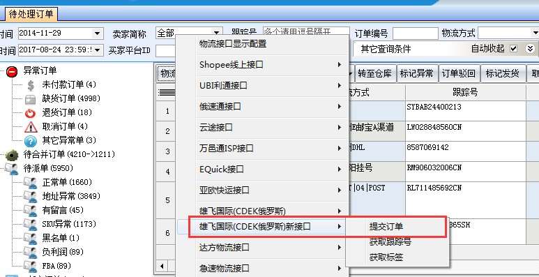 勾选需要提交的订单,然后点击物流接口找到里面的雄飞国际物流接口,去提交订单,获取跟踪号和标签,如下图所示