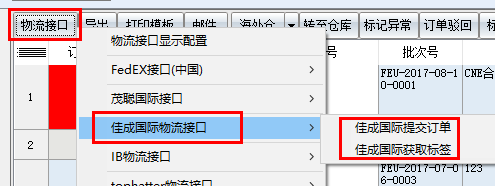 勾选需要提交的订单,然后点击物流接口找到里面的杭州佳成国际,选择杭州佳成国际提交订单去提交申请跟踪号,如下图所示