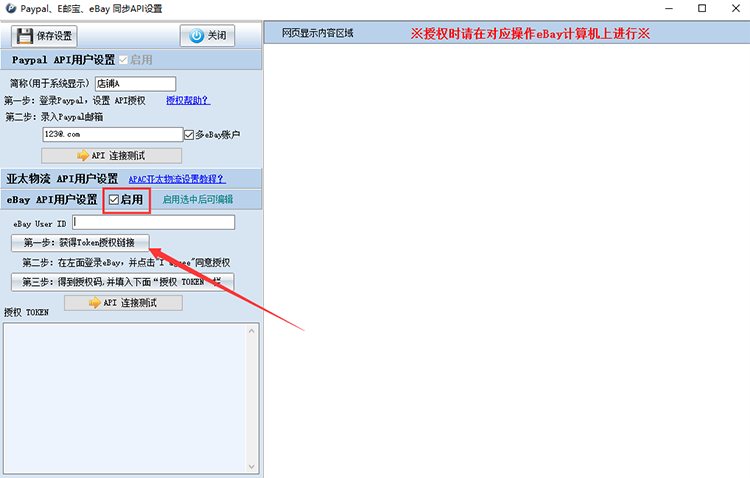 按钮,并确认“Ebay API用户设置” 后面的“启用复选框”被勾选,然后按提示步骤进行操作即可。如下图: