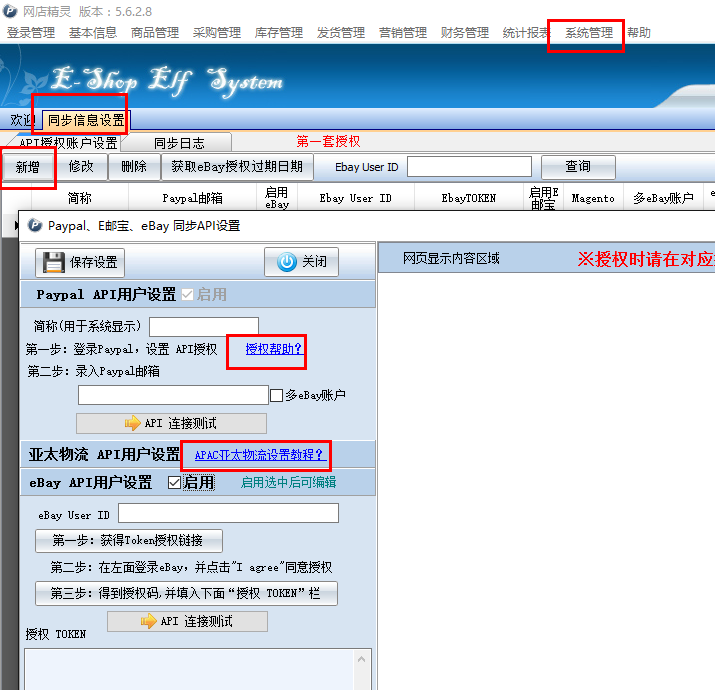 ,然后在系统管理—同步信息设置里面点新增,在弹出来的界面里面,把简称写一下(就是给店铺取一个名字),然后点击授权帮助,按里面步骤来授权paypal邮箱和ebay账号