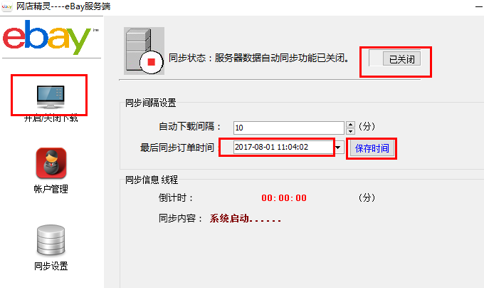 最后把这里面的最后同步订单时间向前调几天,点后面的保存时间,最后再点一下上面的这个” 已关闭”按钮变成已开启状态, 服务端就会自动同步店铺上订单