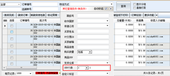 (1)未捡货里面更多查询条件选择sku个数等于1的订单
