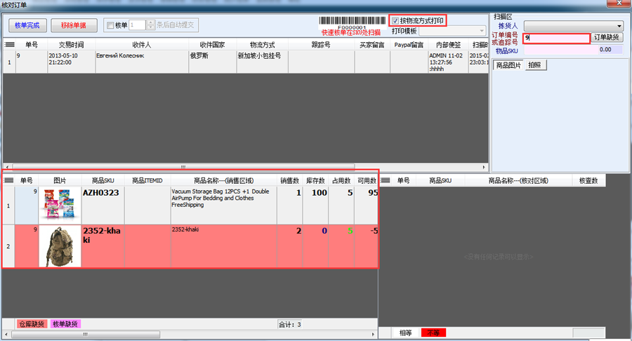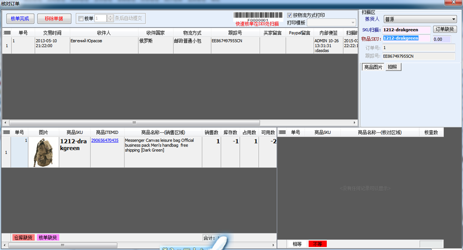 (5)随便捡起一个SKU扫描,软件会把SKU关联的订单给显示出来并且打印地址标签出来(如果按照物流方式打印标签,需要在基本信息--物流方式里面设置打印标签,如果一个商品对应多个订单,软件会随机出来一个订单的,只到所有商品扫描完为止),拿起包装袋按照提示的数量包装,订单会自动转到下一步去捆单称重计算运费的环节,如果订单捡货出现问题,这个地方将无法到下一步,必须核查正确才能到下一步这样就能保证每个订单对应的货物都是准确的 。
