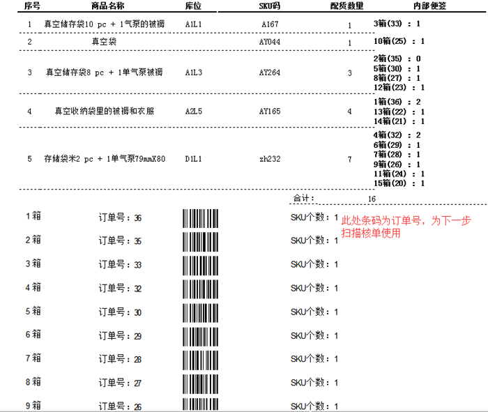 第二种:打印拣货汇总单(汇总单下面是每个箱对应的订单号条码,在核单时,扫描订单号,打印地址标签 )